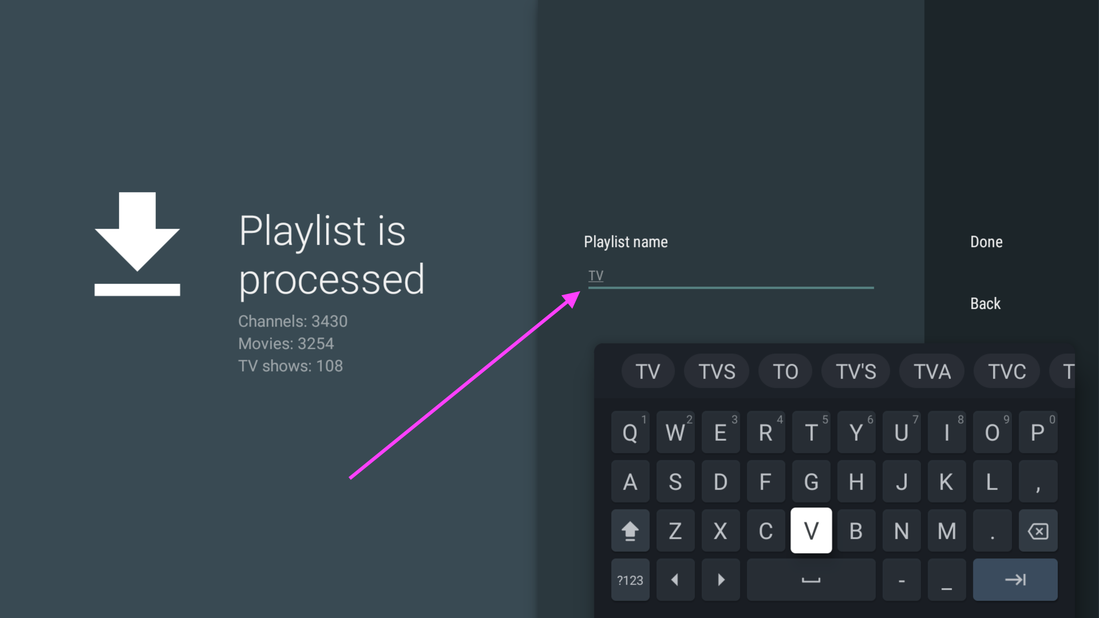 10. Acest pas, este optional. Dupã ce aplicatia a procesat continut-ul pachertului tv, aveti posibilitatea in a redenumi playlist-ul. Noi , in imaginea de mai jos l-am redenumit TV . Dupã redenumirea playlist-ului , apasati Done .