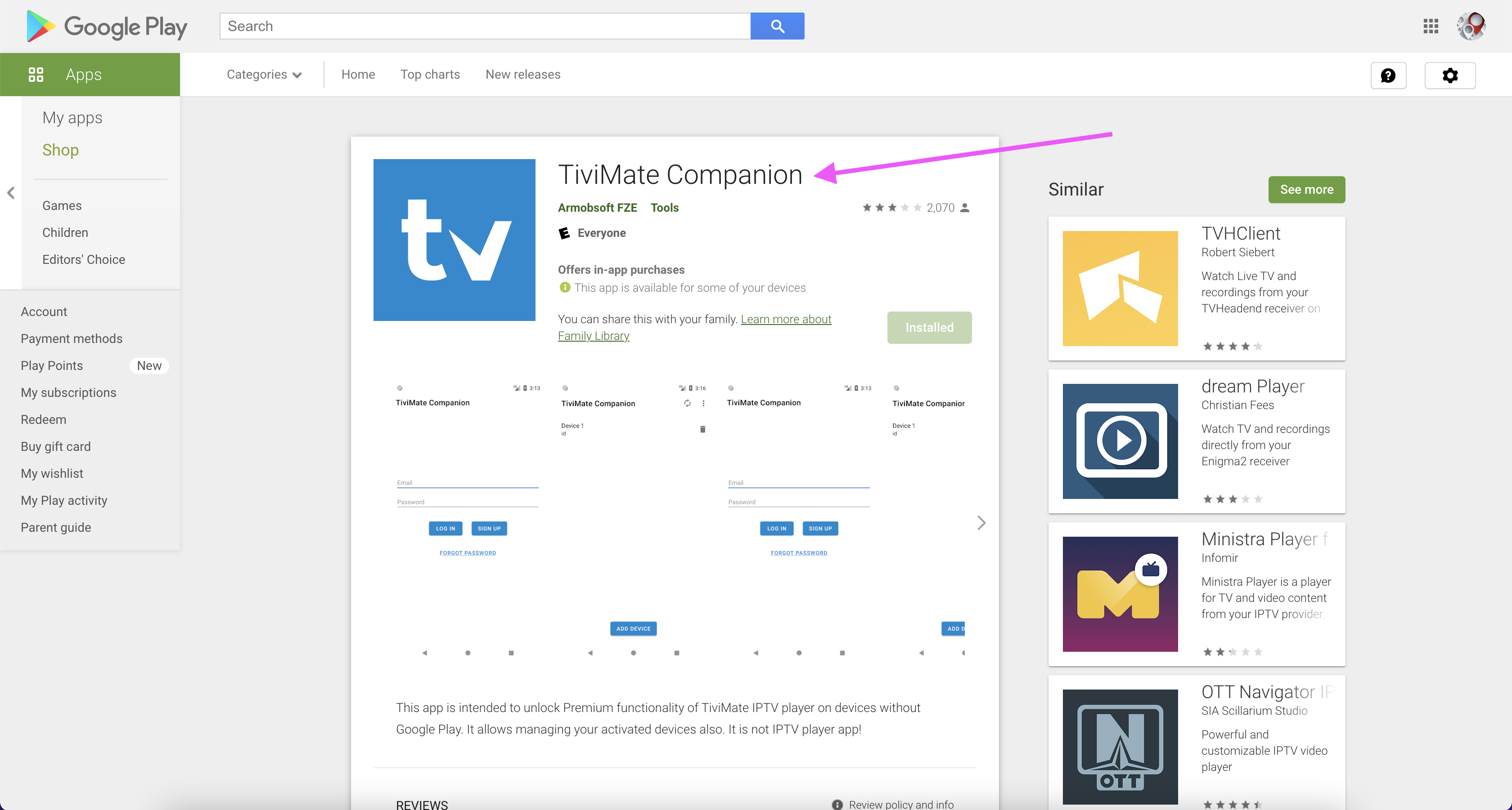 Pentru a instalarea aplicatia TiviMate, necesitã sa avem un cont pe Google Play Store si aplicatia TiviMate Companion ( pentru licenta aplicatiei TiviMate ),  instalata pe un telefon Android , sau un emulator android pe un pc ( din pãcate TiviMate Companion app este disponibil doar pentru platforma Android )