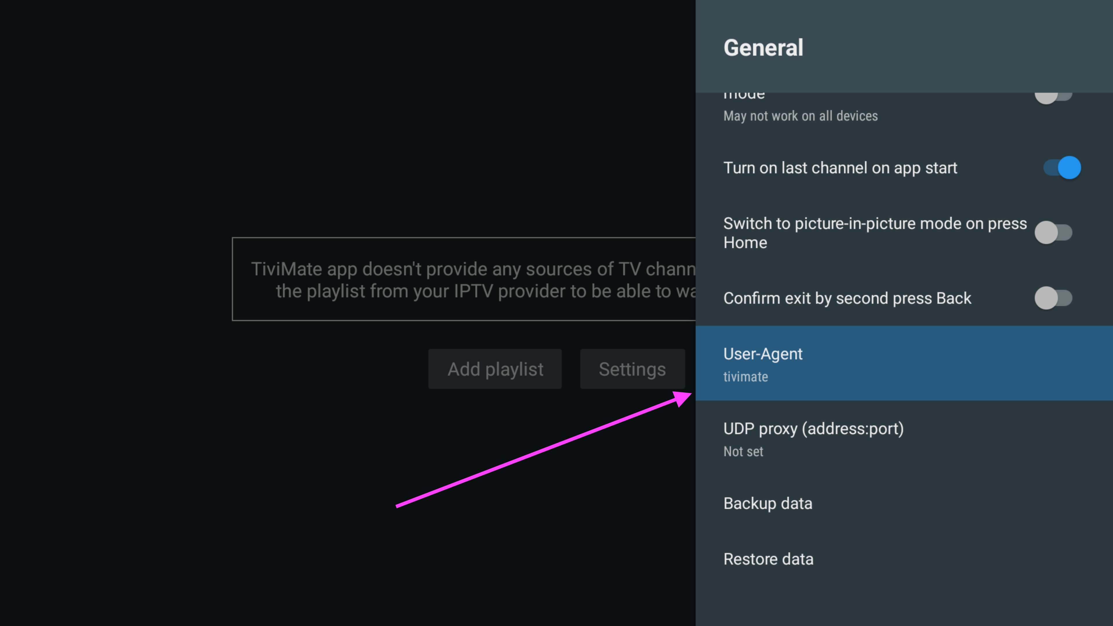 6. Urmãtorul pas este setarea User-Agent. Navigati la Settings --> General, si selectati sectiunea User-Agent , unde se va putea tasta cuvantul tivimate sau, dacã in tiket-ul de suport in care vi se comunicã detaliile de logare pentru pachet-ul tv, user agent este diferit, ve-ti scrie user agent comunicat de catre echipa de suport. Acestã setare este criticã si, dacã nu este efectuatã corespunzãtor , poate duce la blocarea dispozitiv-ului, a adresei IP ,cat si a aplicatiei. Daca utilizati multiple dispozitive si a-ti achitionat conexiuni extra in abonament-ul comandat, user agent poate fi diferit, si vi se va comunica intr-un tiket de sport, in contul dumneavostra administrativ, ce necesitã tastat.