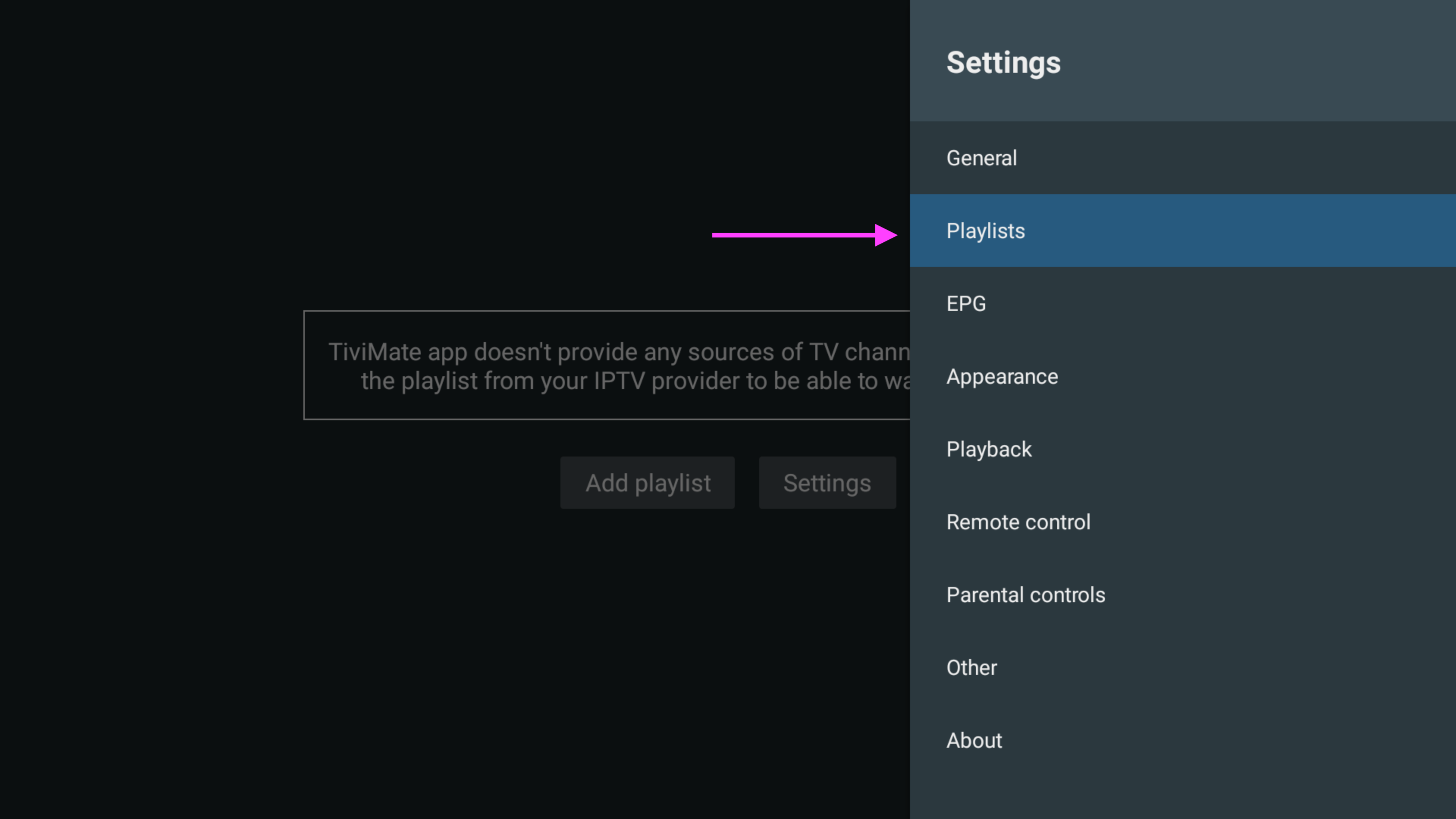 7. Odatã ce avem aplicatie licentiata, user-agent setat corespunzãtor, este momentul sã adaugam, sau sã setem pachetul tv in aplicatiei. Pentru a face asta, navigati la Settings --> Playlists: